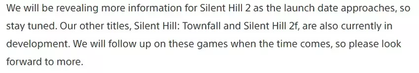 W artykule producenta serii Silent Hill, Motoi Okamoto, opublikowanym na PlayStation.Blog, wyraźnie stwierdzono, że wszystko jest w porządku z grami, a rozwój Silent Hill: Townfall i Silent Hill f przebiega zgodnie z planem. O tych horrorach powiemy "kiedy nadejdzie właściwy czas".