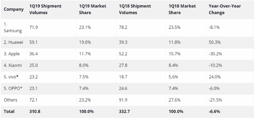IDC opowiedział o wysyłkach smartfonów w I kwartale 2019 r.: Huawei wzrósł o 50%, podczas gdy Apple spadł o 30%