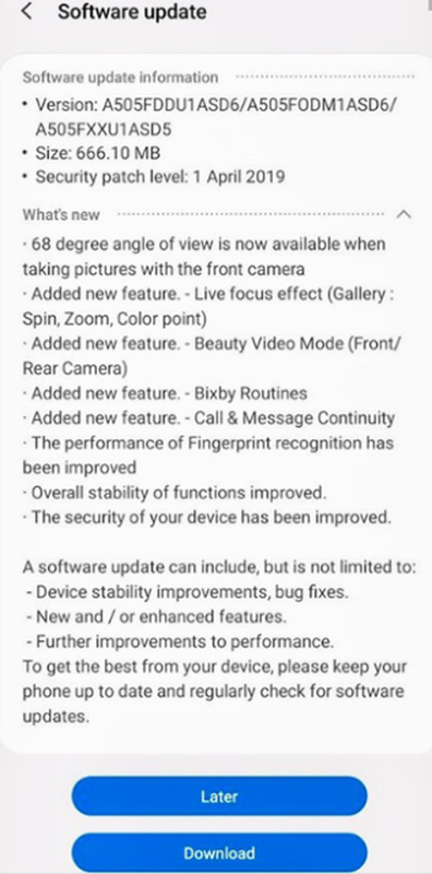 Oprogramowanie waży 670 MB i ma kwietniowy patch bezpieczeństwa oraz wiele nowych funkcji związanych z kamerą. Twórcy dodali możliwość robienia zdjęć przednim aparatem pod kątem 68 °, wideo z trybu Beauty Mode i kilka nowych efektów w trybie Live Focus. Ponadto nowe oprogramowanie układowe poprawiło skaner ekranowy i dodało obsługę funkcji Bixby Routines, która działa podobnie do aplikacji. IFTTT (If This Then That). Wcześniej był dostępny tylko w serii S10 flagowego smartfona Galaxy i Galaxy A80.