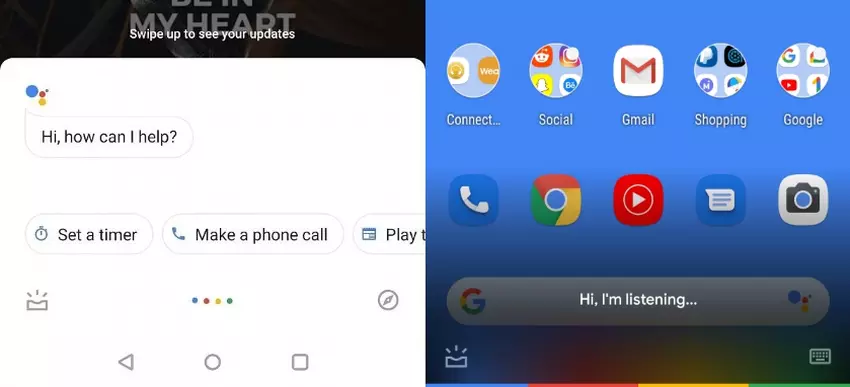 Zaktualizowany Google Assistant różni się całkowicie od obecnej wersji. Zamiast białego interfejsu otrzymał wygląd z przezroczystym tłem, dwoma przyciskami, napisem „Witam, ja słucham” i zastrzeżonym kolorowym paskiem, podobnym do wskaźnika na Chromebooku Pixel. Wszystko wygląda bardzo minimalistycznie.