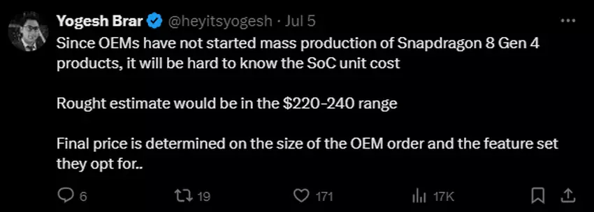 Kolejna generacja mobilnego procesora Qualcomm, Snapdragon 8 Gen 4, będzie znacznie droższa od swojego poprzednika. Według wtajemniczonego Yogesha Brara, cena nowego chipsetu może osiągnąć 240 USD, czyli o 25-30% więcej niż cena Snapdragona 8 Gen 3.