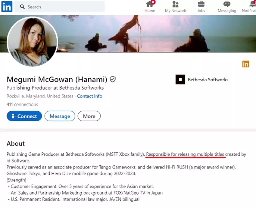 Megumi McGowan niedawno objęła stanowisko producenta w Bethesda Softworks, oddziale wydawniczym id Software. Z jej profilu na LinkedIn wynika, że jest ona odpowiedzialna za wydawanie WSZYSTKICH projektów produkowanych przez id Software.