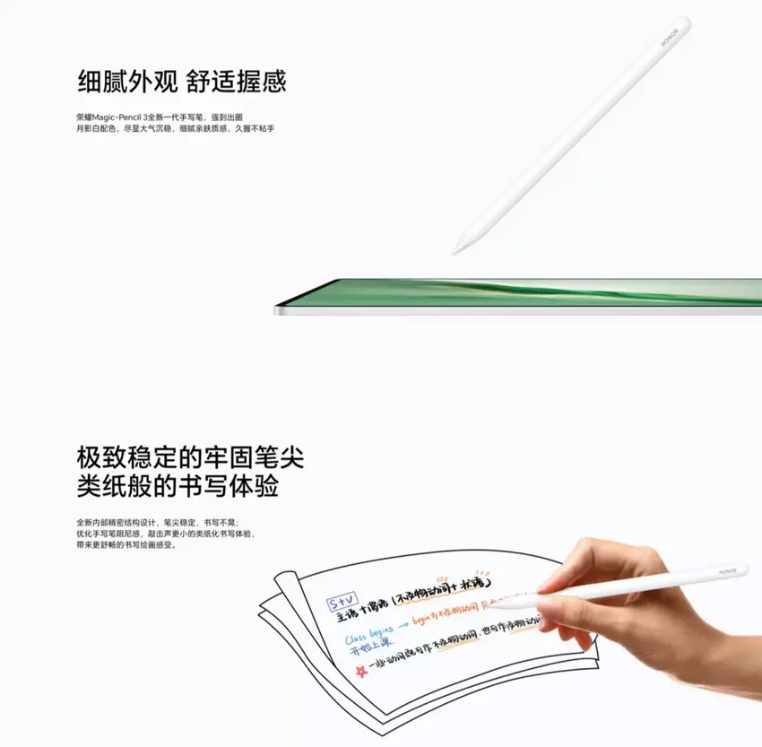 Rysik Honor Magic Pencil 3 Moon Shadow White został wprowadzony na rynek wraz z tabletem Honor MagicPad 2. Ma magnetyczną konstrukcję, obsługuje sterowanie powietrzem i można go w pełni naładować w zaledwie 45 minut. Rysik można również przymocować do tabletu w celu bezprzewodowego ładowania. Honor Magic Pencil 3 może działać do 10 godzin na jednym ładowaniu.