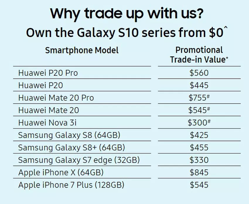 W programie Trade-in z udziałem takich modeli: Huawei P20, Huawei P20 Pro,  Huawei Mate 20, Huawei Mate 20 Pro i Huawei Nova 3i. Oddając je, użytkownik otrzyma zniżkę na Galaxy S10 od $ 300 do $ 755 ( za Mate 20  Pro). Ale prawdziwy rekordzista jest Apple iPhone X, za którego dają $ 845.