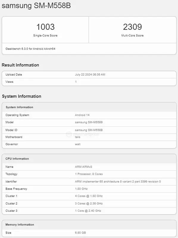Galaxy M55S uzyskał 1003 punkty w testach jednordzeniowych Geekbench i 2309 w testach wielordzeniowych, co wskazuje na jego wydajność.
