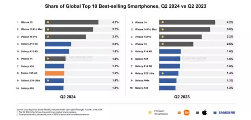 W porównaniu do ubiegłego roku, kiedy Galaxy A14 4G był najlepiej sprzedającym się smartfonem, średnia cena sprzedaży smartfonów Samsunga wzrosła. W globalnym rankingu iPhone 15 zajął pierwsze miejsce, podczas gdy iPhone 15 Pro Max i iPhone 15 Pro zajęły odpowiednio drugie i trzecie miejsce.
