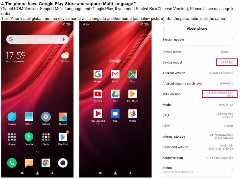 Jeden z właścicieli Redmi K20 Pro powiedział, że po zainstalowaniu globalnej wersji beta oprogramowania układowego MIUI 10 Global 9.5.31 w ustawieniach smartfona, jego nazwa została zmieniona - teraz na liście znajduje się Xiaomi Mi 9T Pro. Ponadto usługi Google pojawiły się wraz z globalną wersją aktualizacji.