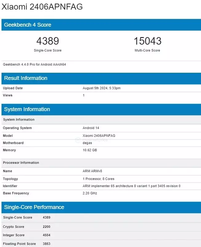 Urządzenie o numerze modelu 2406APNFAG uzyskało 4389 punktów w teście jednordzeniowym i 15043 punktów w teście wielordzeniowym Geekbench w wersji 4.4.0. Model z testu jest zasilany przez system Android 14 i jest wyposażony w 12 GB pamięci RAM. Oczekuje się, że smartfon będzie korzystał z chipsetu MediaTek Dimensity 8300 Ultra.