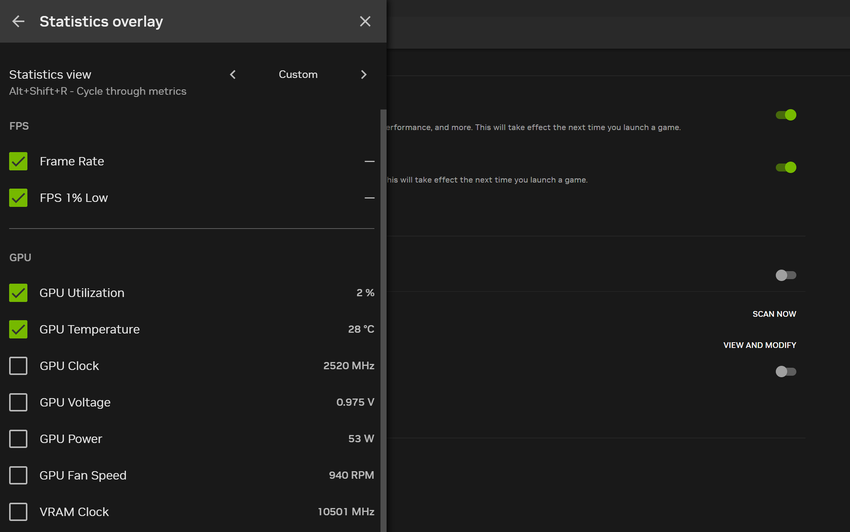 Ponadto nakładka statystyczna została zaktualizowana i pokazuje teraz 1% niskiej liczby klatek na sekundę, użycie procesora, opóźnienia i inne informacje o GPU. W zeszłym miesiącu Nvidia dodała również funkcję dostrajania GPU jednym kliknięciem.