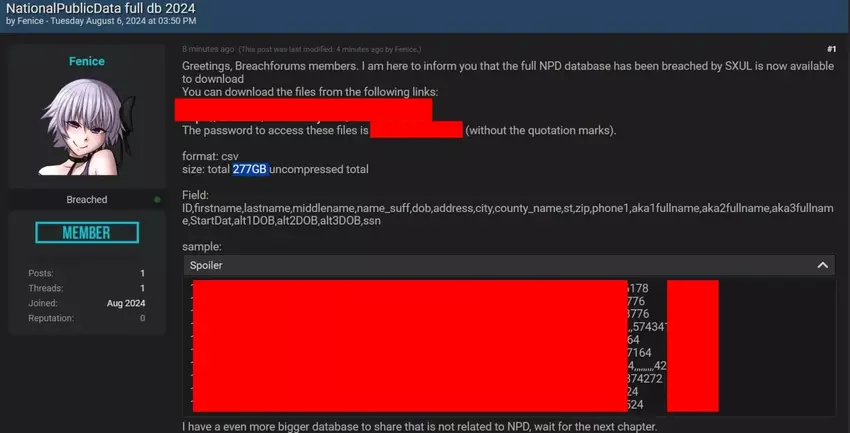 Dane te mogą być wykorzystywane do kradzieży tożsamości, otwierania fałszywych kont kredytowych, zaciągania pożyczek i składania fałszywych zeznań podatkowych. Wyciek miał miejsce w kwietniu 2024 r., a grupa hakerska USDoD próbowała sprzedać dane za 3,5 miliona dolarów. Jerico Pictures, która jest właścicielem National Public Data, stoi obecnie w obliczu procesów sądowych za nieodpowiednią ochronę danych. National Public Data nie wydała jeszcze oficjalnego oświadczenia w sprawie incydentu.