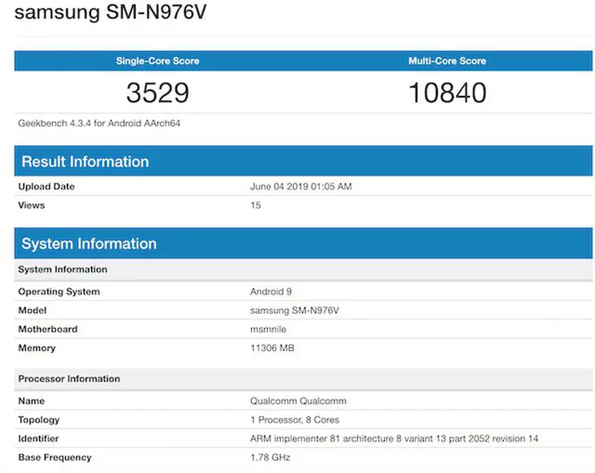 Jak podaje kilka źródeł jednocześnie, są to dwie najlepsze wersje urządzenia z obsługą sieci 5G. Pierwszy SM-N976V ma flagowy procesor Snapdragon 855 i 12 GB pamięci RAM. Litera V na końcu numeru oznacza, że smartfon został zaprojektowany dla amerykańskiego operatora Verizon. W teście pojedynczego rdzenia nowość zyskuje 3529 punktów, a w teście wielordzeniowym 10840.