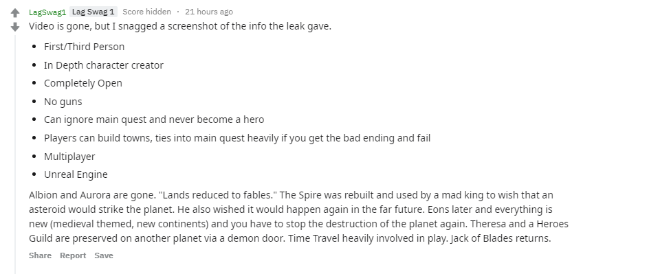 Jeśli wierzyć użytkownikowi Reddit, w Fable 4 na gracze czekają całkowicie otwarty świat, bez broni, budowy miast i multiplayera. Ważną cechą jest główne zadanie, które można ignorować i nie być bohaterem. Gra się rozwija na silniku Unreal Engine, który zapewnia graczom z nadzieją na dobrą grafiką.
