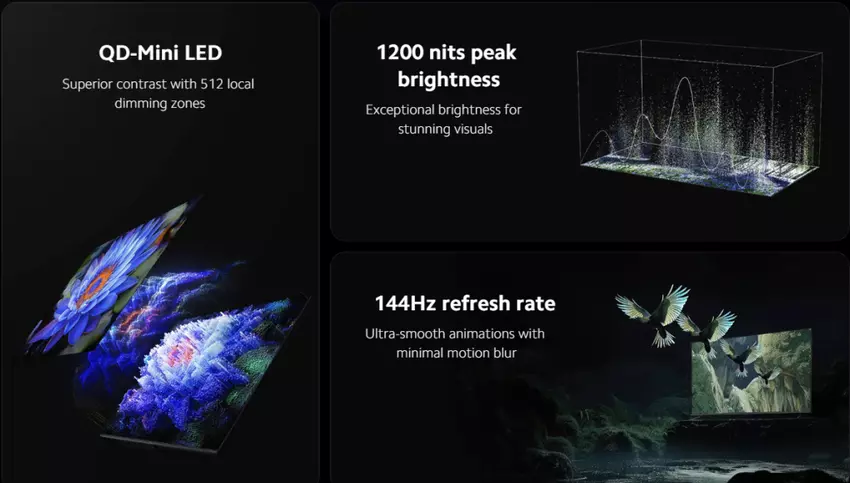 Model ten wyposażony jest w pełnoekranowy metalowy wyświetlacz z technologią QD-Mini LED, która zapewnia 512 niezależnych stref przyciemniania dla lepszego kontrastu. Maksymalna jasność telewizora wynosi 1200 nitów, co gwarantuje doskonałą jakość obrazu nawet w trudnych warunkach oświetleniowych.