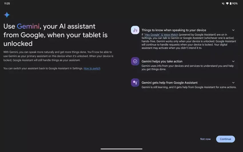 Użytkownicy mogą nadal konfigurować tablet za pomocą skrótu na ekranie głównym, ale interfejs Gemini nie jest jeszcze zoptymalizowany pod kątem dużych ekranów, a pasek aplikacji jest wyśrodkowany.