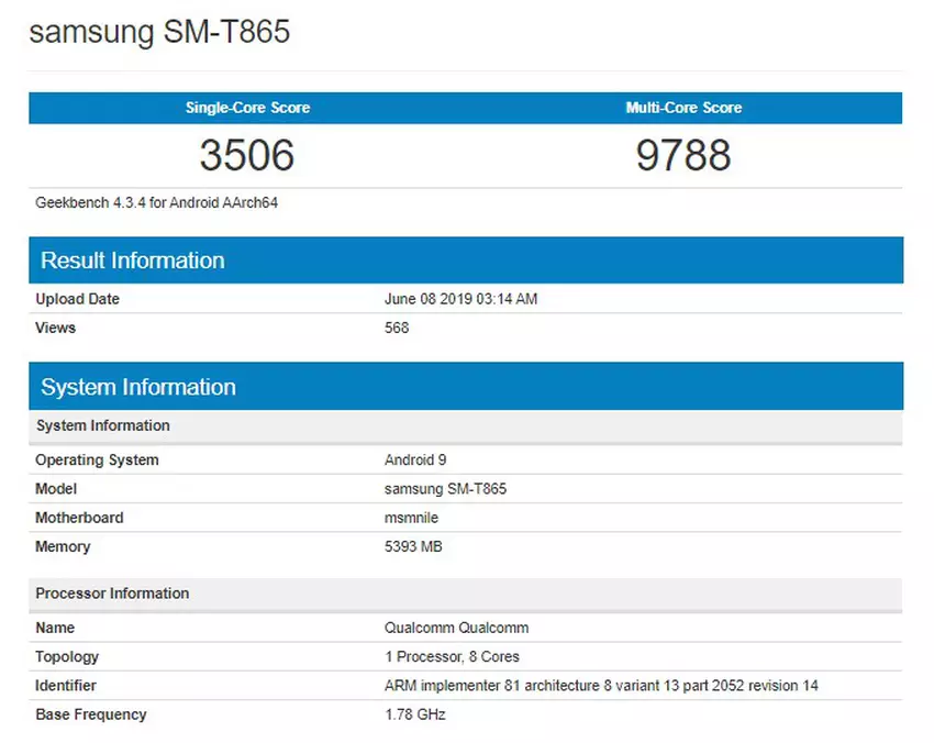 W bazie danych testu wydajności Geekbench zauważyliśmy urządzenie firmowe o numerze modelu SM-T865. Według kilku źródeł jest to flagowy tablet Galaxy Tab S5. Urządzenie działa na flagowym 7-nanometrowym procesorze Qualcomm Snapdragon 855 połączonym z 6 GB pamięci RAM. Posiada wstępnie zainstalowany system operacyjny Android 9 Pie. Nowość zdobyła odpowiednio 3506 i 9788 punktów w testach jedno i wielordzeniowych.