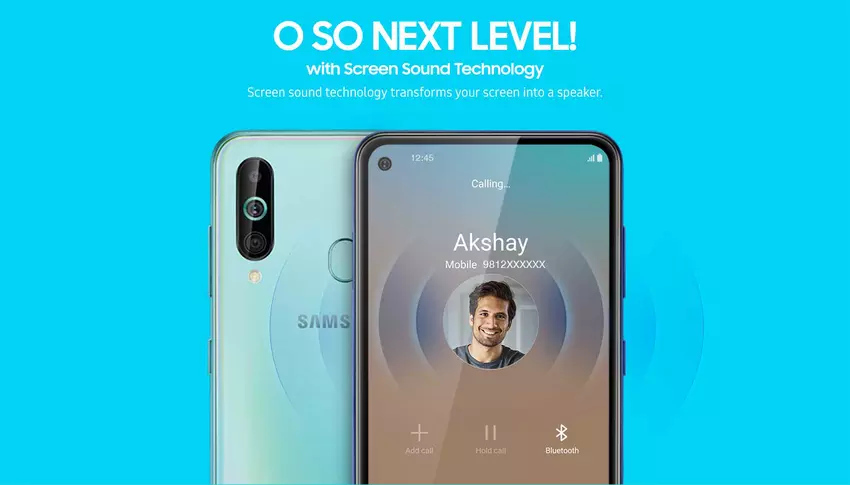 Smartfon ma 6,3-calowy wyświetlacz IPS o rozdzielczości Full HD+, który zajmuje 91,8% w przedniej części panelu. To jest ekran Infinity-O, podobny do Galaxy A8s i Galaxy S10. Jest okrągły otwór do kamery przedniej.