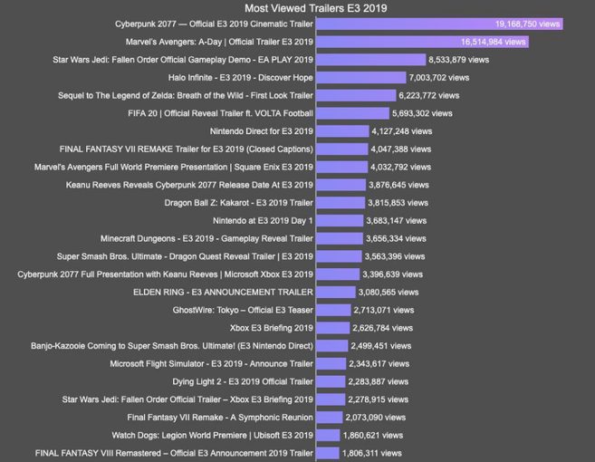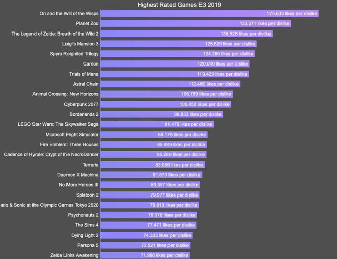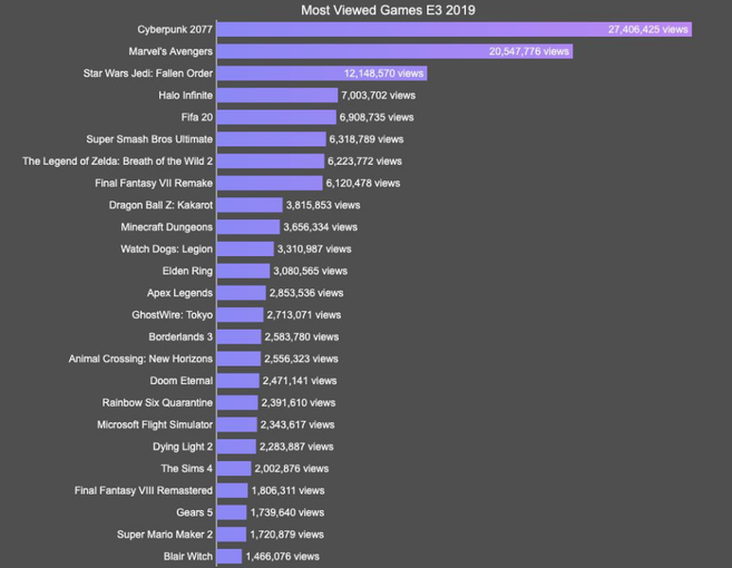 Daniel Ahmad, analityk, podzielił się swoimi statystykami na temat wystawy. Sądząc po zdjęciach, przyczepa Cyberpunk 2077 była najczęściej oglądana na E3 2019, a Ori był liderem pod względem liczby polubień.