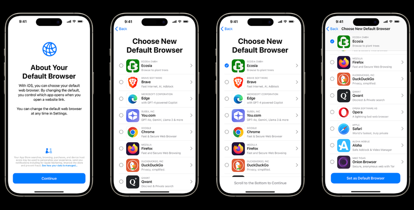 Użytkownicy będą mogli również usunąć więcej wbudowanych aplikacji, w tym App Store, Wiadomości, Aparat, Zdjęcia i Safari. Jedynymi wyjątkami będą aplikacje Ustawienia i Telefon. Zaktualizowany ekran wyboru przeglądarki będzie wyświetlany wszystkim użytkownikom, którzy mają domyślnie zainstalowane Safari, z dodatkowymi informacjami o przeglądarkach innych firm.