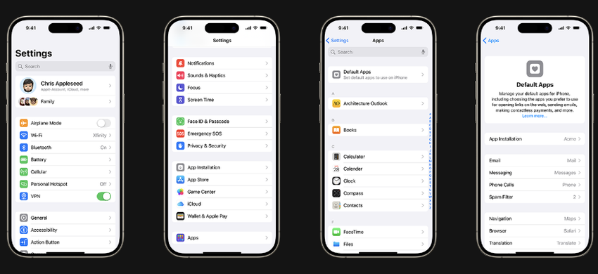 W iOS 18 i iPadOS 18 użytkownicy iPhone'ów i iPadów w UE będą mogli instalować domyślne aplikacje innych firm do połączeń, wiadomości, zarządzania hasłami, klawiatur i filtrów antyspamowych. Zmiany te pojawią się w sekcji "Aplikacje domyślne" w ustawieniach.