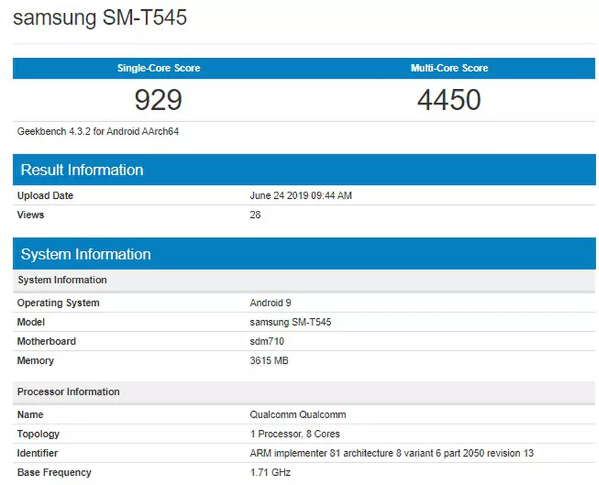 W bazie danych testu wydajności Geekbench zauważyliśmy nowe urządzenie o numerze SM-T545. Raport stwierdza, że urządzenie ma 4 GB pamięci RAM i wersję systemu operacyjnego Android 9 Pie. Nowość działa na ośmiordzeniowym procesorze Snapdragon 710 o maksymalnej częstotliwości zegara 1,71 GHz. Dzięki niemu tablet zdobywa sporą ilość punktów w teście wielordzeniowym (4450), ale w teście pojedynczego rdzenia wyniki nie są zbyt dobre (929). Nie jest to jeszcze ostateczna próbka urządzenia, więc układ i system powinny być zoptymalizowane.