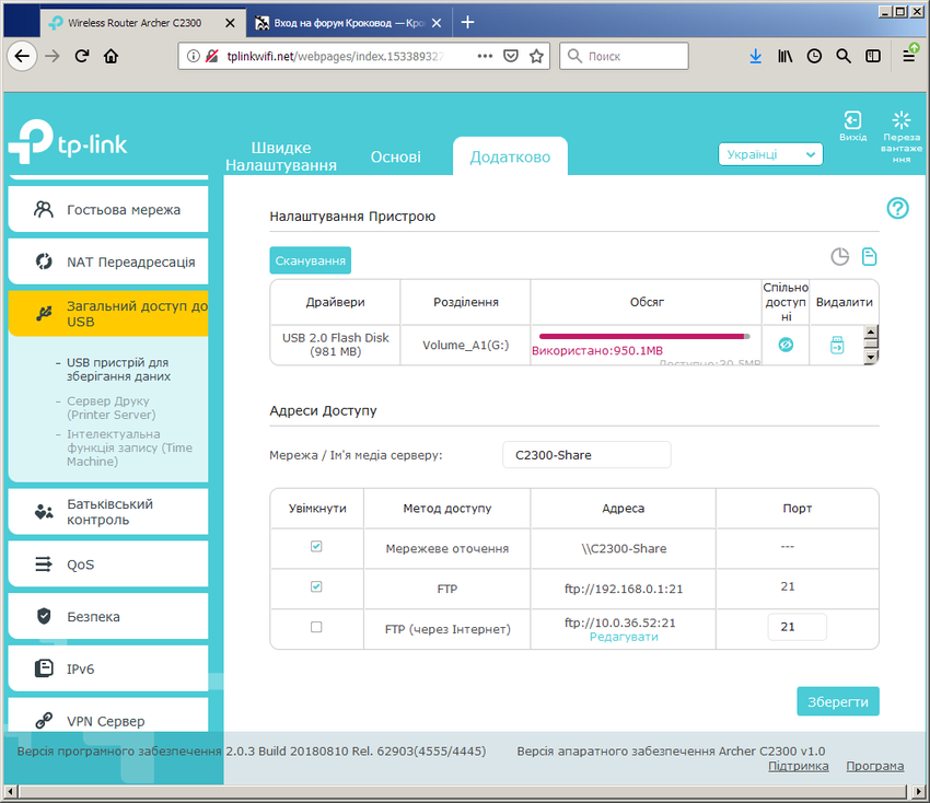 Z drukarką nie jest to takie proste - musisz zainstalować sterownik drukarki i narzędzie do uruchamiania i konfigurowania serwera druku na komputerze. W zaawansowanych ustawieniach napędu USB dostępna jest jeszcze jedna funkcja - może być używana do zapisywania kopii zapasowych z komputerów Apple przy użyciu funkcji Time Machine. Nie udało mi się przetestować tej funkcji w praktyce z powodu braku technologii Apple.