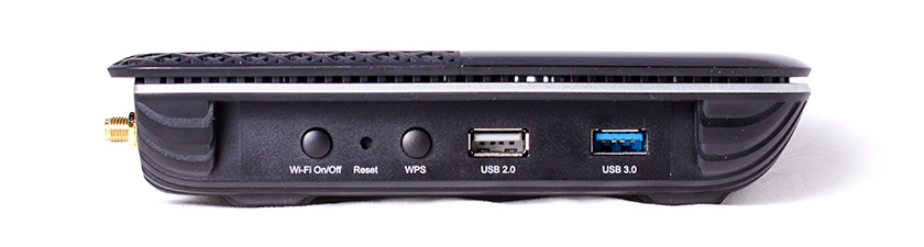 Układ jest standardowy - anteny, porty Gigabit LAN i WAN, złącze i przełącznik zasilania znajdują się z tyłu routera. Na jednej ze stron znajdują się dwa porty USB (jedna wersja 2.0, druga 3.0), a także przyciski WPS, Wi-Fi wyłączenia i ukryty przycisk resetowania. Wszystkie informacje potrzebne do skonfigurowania sieci (adres MAC routera, hasło administratora i hasło sieci bezprzewodowej) znajdują się na naklejce na dole obudowy, a także są duplikowane na osobnej karcie dołączonej do pakietu dokumentów.