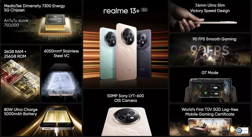 realme 13+ 5G: wyświetlacz AMOLED 120 Hz, stopień ochrony IP65, chip Dimensity 7300 Energy i cena od 275 USD