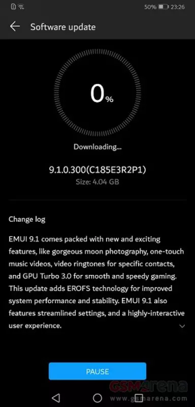 Nowa wersja oprogramowania układowego ma numer 9.1.0.300 (C185E3R2P1) i waży aż 4 GB. Dodano wiele przydatnych zmian. Na przykład akcelerator graficzny GPU Turbo 3.0, nowy system plików EROFS, nieco zmodyfikowany wygląd, a także kompilator Arc Compiler, który poprawia stabilność i szybkość smartfona.