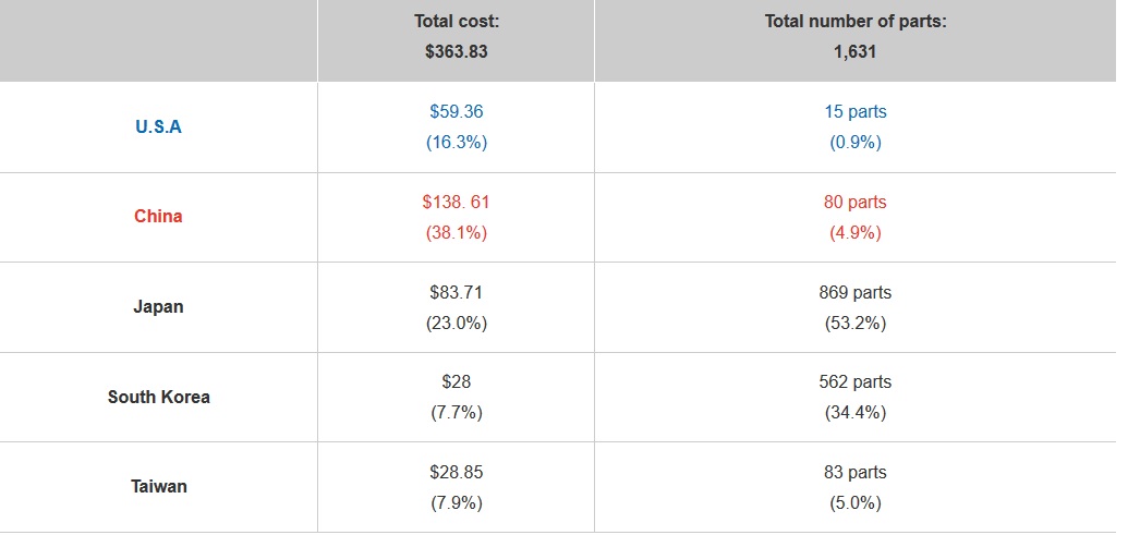 Jak się okazało, tylko w smartfonie 1631 części. Ale tylko 15 z nich (a jest to 0,9%) to elementy amerykańskiej produkcji. Obejmuje to moduły pamięci DRAM Micron Technology i bezpieczne szkło Corning, chipy producenta Kalifornii Qorvo itp.