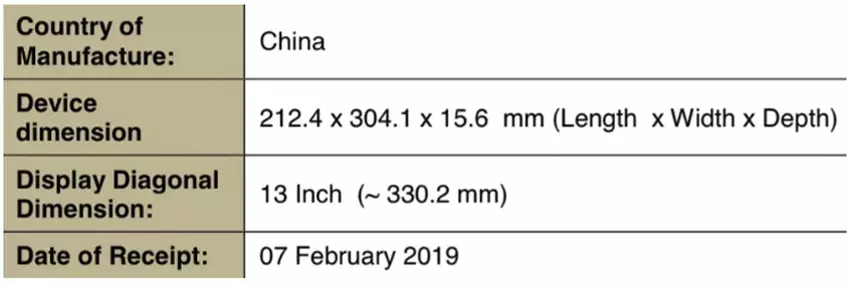 Laptop będzie miał 13-calowy ekran, obsługuje ładowanie 61-watowe (20,3 V przy 3, A) i takie wymiary: 212,4 × 304,1 × 15,6 mm.
