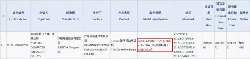 Certyfikacja ujawniła, że smartfon zostanie wydany w dwóch wersjach z numerami modeli I001DA i I001DB. Pierwszy otrzyma szybkie ładowanie przy 18 W, podobnie jak flagowy Asus ZenFone 6, a drugi przy 30 W. Dla porównania, jego konkurenci Nubia Red Magic 3 i Xiaomi Black Shark 2 mają mniejszą moc szybkiego ładowania: 27 W i 25 W, odpowiednio.
