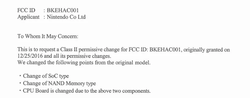Jeśli wierzyć The Verge, Nintendo złożyła wniosek o zastąpieniu składników w Switch. Firma wydała uchwałę drugiej klasy, która daje prawo do interweniowania w pamięci i SoC (system na chipie). Być może, Nintendo planuje zaktualizować Tegra X1, który stał się „mózgiem” hybridowej Switch.