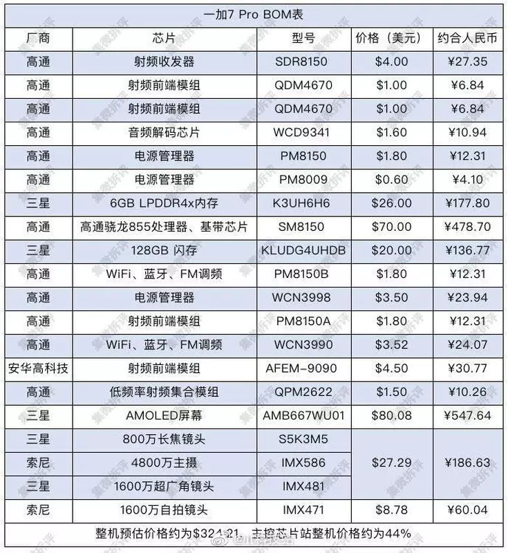 Potrójna kamera kosztuje 27,29 USD, 6 GB pamięci RAM - 26 USD, 128 GB pamięci flash - kolejne 20 USD.