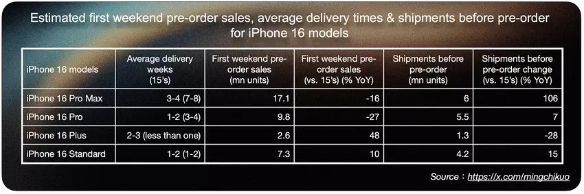 Według doniesień, sprzedaż iPhone'a 16 Pro Max jest o 16% niższa, a iPhone'a 16 Pro Max o 27% niższa niż sprzedaż zeszłorocznych modeli w tym samym okresie. Jednocześnie znacznie wzrosło zainteresowanie modelami standardowymi i Plus. Zamówienia przedpremierowe na podstawowy model iPhone'a 16 wzrosły o 10%, a iPhone'a 16 Plus o 48% w porównaniu do iPhone'a 15 Plus. Ogólnie rzecz biorąc, dostawy iPhone'a 16 wyniosły około 37 milionów sztuk, co stanowi spadek o 12,7 procent w porównaniu do iPhone'a 15 w pierwszy weekend.