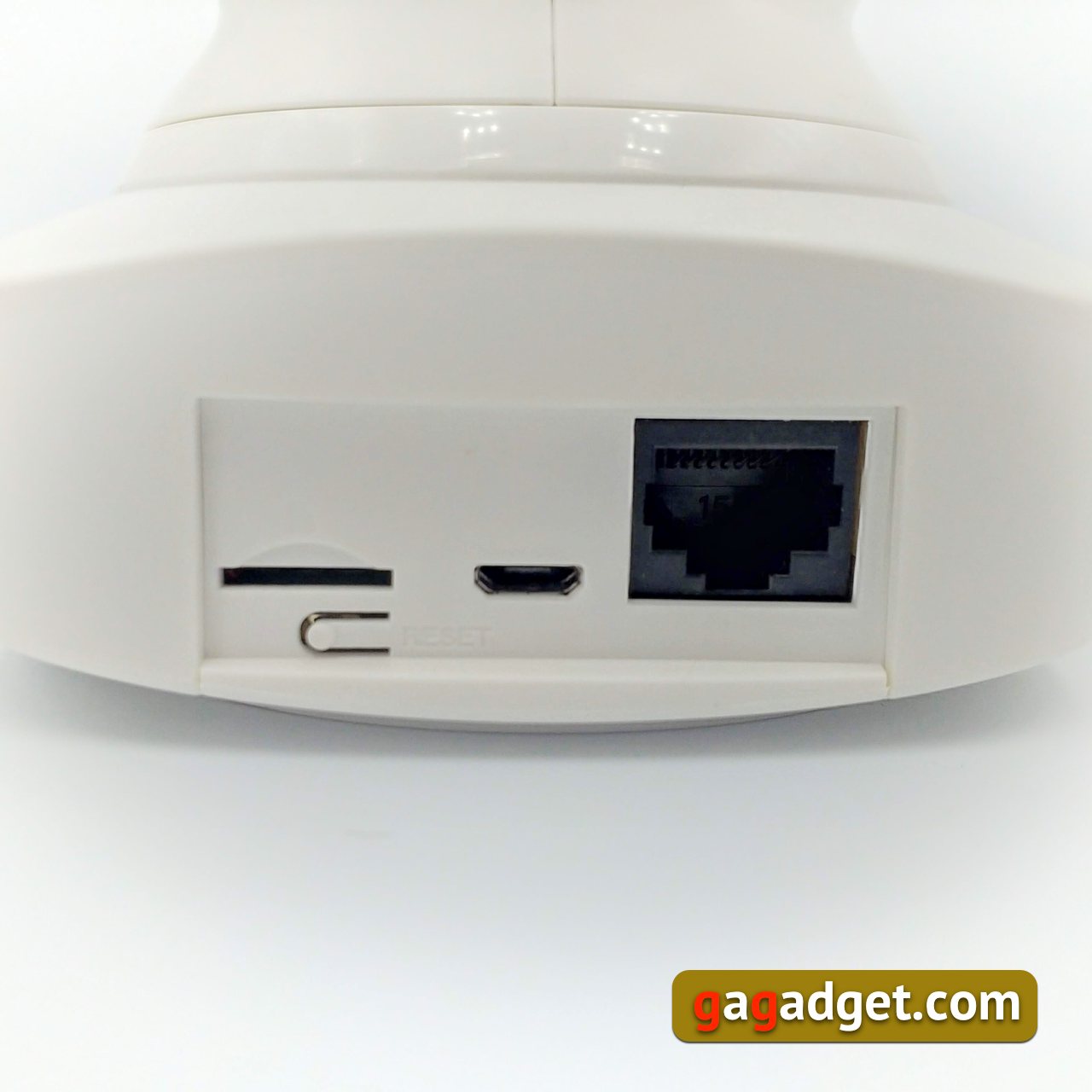 Śnieżnobiały kombinezon astronauta z nieprzezroczystym czarnym hełmem na wizjerze. Oto pierwsze wrażenia z kamery, gdy tylko trafią ona w czyjeś oczy. I rzeczywiście: obudowa może z powodzeniem odgrywać rolę w jakimś kosmicznym thrillerze - najważniejsze jest, aby nie pokazywać ciała tego astronauty poniżej ramion. I tam - całkiem zwyczajna platforma z łącznikami, na tej prostokątnej platformie znajduje się mikrofon (przód) i otwory komunikacyjne z tyłu (połączenie zasilania, złącze RJ45 do przewodowego Internetu, gniazdo karty pamięci i przycisk resetowania). Po bokach prostokątnego cokołu znajdują się otwory głośnikowe dla dźwięków wytwarzanych przez kamerę.