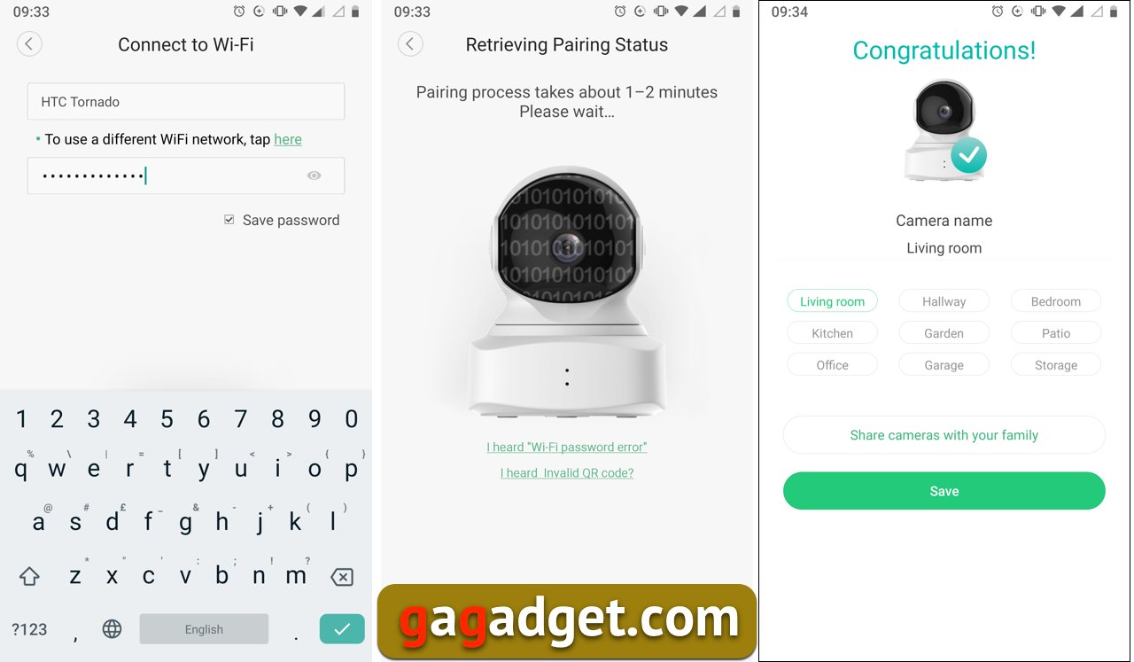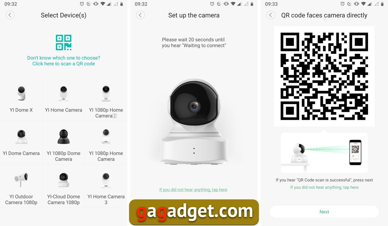 Aplikacja jest ładowana z Google Play lub Apple App Store bez żadnych problemów: możesz go znaleźć ręcznie lub użyć kodu QR, który znajduje się w instrukcji. Po uruchomieniu aplikacji musisz zalogować się na swoje konto Yi lub je utworzyć. Następnie powinieneś postępować zgodnie z instrukcjami wyświetlanymi na ekranie telefonu: wprowadź login i hasło z domowego Internetu, pokaż aparatowi kod QR wygenerowany przez program, poczekaj na potwierdzenie pomyślnego połączenia - a to wszystko, aparat jest gotowy do użycia! Cały proces trwa około minuty i towarzyszą mu komentarze głosowe aparatu w języku angielskim.