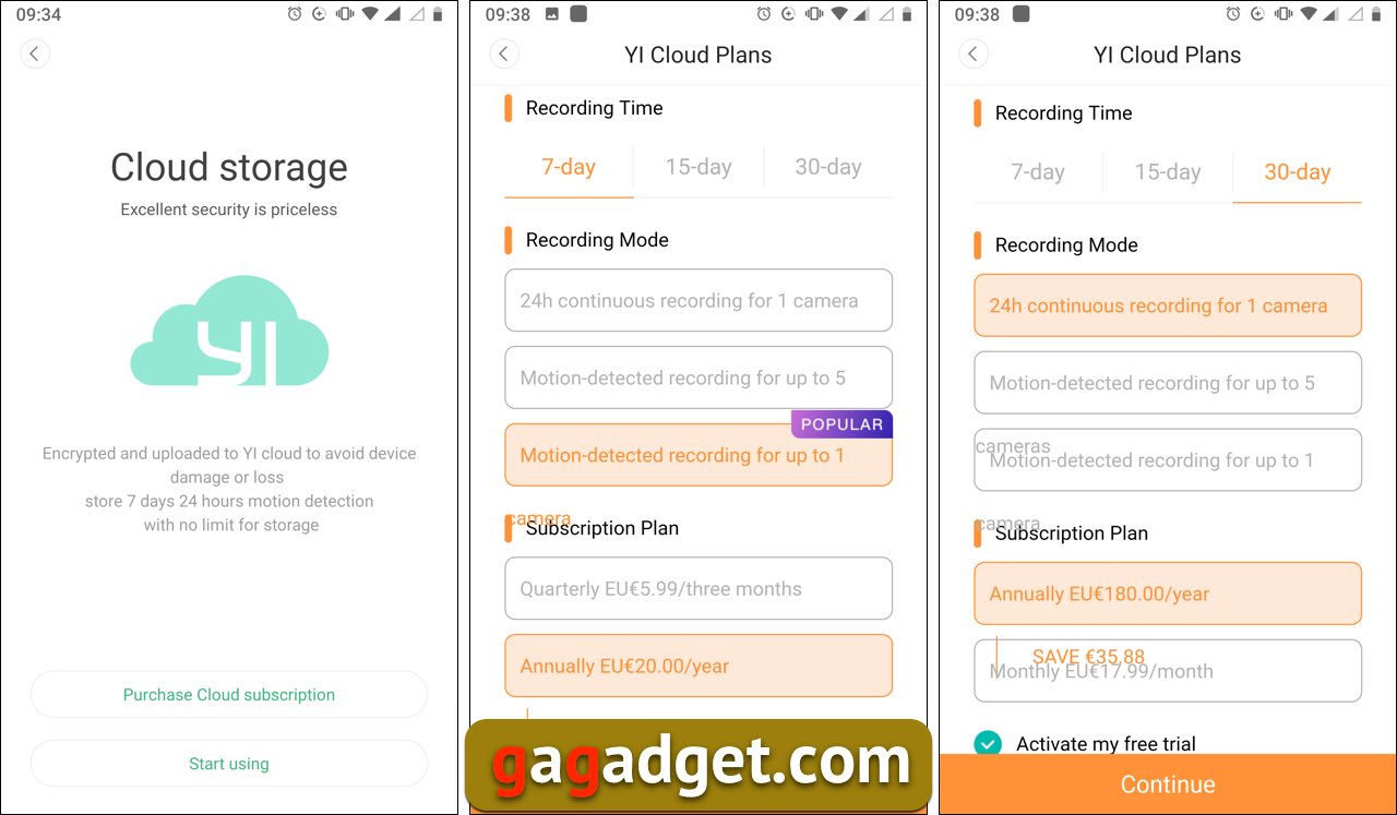 Kamera ma proste i przejrzyste ustawienia, jak widać na zrzutach ekranu. Możesz wyłączyć wskaźnik działania kamery, aktywować wykrywanie ruchu (z powiadomieniami w kurtynie smartfona), podświetlenie w nocy, włączyć tryb monitorowania dziecka, wyświetlić kalendarz wydarzeń, zrobić zdjęcie, porozmawiać z aparatem w trybie walkie-talkie lub skorzystać z płatnej usługi subskrypcji. Przy okazji, kiedy kupujesz, otrzymujesz 33% zniżki na wszystkie plany: możesz zrobić film na tydzień, 15 lub 30 dni - wtedy wszystkie nagrania z kamery będą dostępne dla ciebie przez określony czas. 7-dniowy zapis wideo w chińskiej chmurze na jedną kamerę kosztuje 6 euro za 3 miesiące lub 20 euro rocznie; przechowywanie filmów przez 30 dni kosztuje 18 euro miesięcznie lub 180 rocznie. Ogólnie rzecz biorąc, aplikacja jest przejrzysta i łatwa w użyciu, wystarczająco szybka i elastyczna nawet w przypadku korzystania z mobilnego Internetu (gdy trzeba spojrzeć zdalnie co pokazuje kamera).
