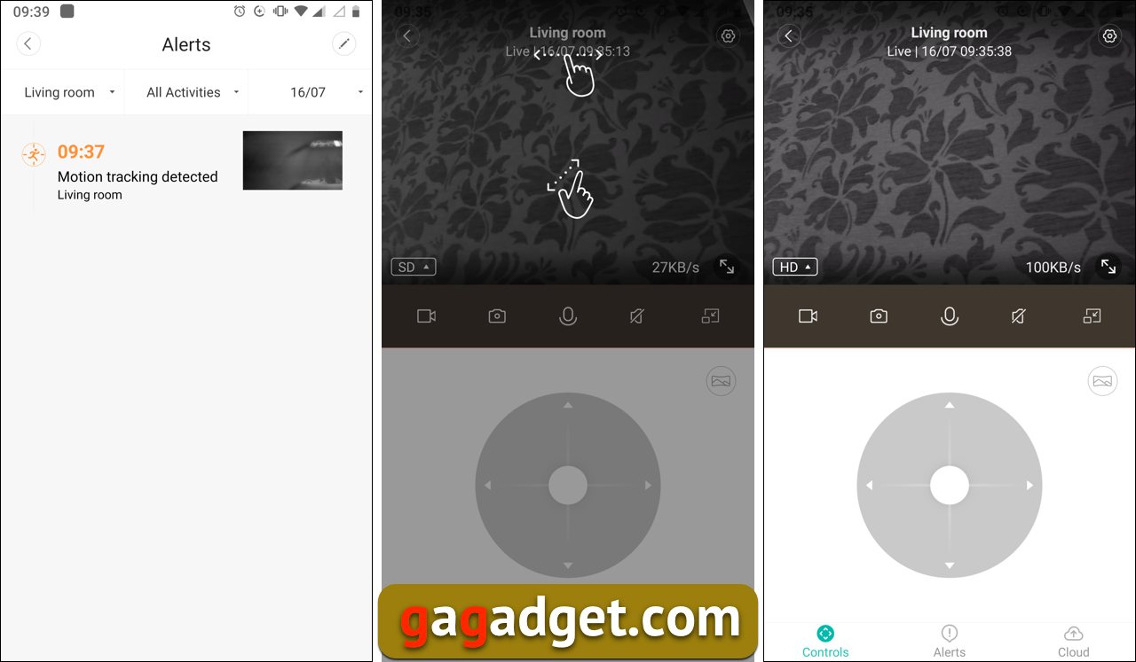 Kamera może obracać głowę o 360 stopni i pochylać oraz podnosić obiektyw o 102 stopnie. Podczas przesuwania silników nie słychać wcale, i oni po prostu nie mogą obudzić dziecka lub kota, ani przestraszyć włamywaczy. A przeciwko nim ten aparat jest całkiem skuteczny: ma wbudowane śledzenie poruszającego się obiektu, to znaczy może podążać za przechodzącymi ludźmi, automatycznie obracając się za nim. Oczywiście, nie reaguje natychmiast na szybki ruch, ale mimo to, jeśli przejdziesz spokojnie, w każdym razie pozostaniesz w ramce - podąży za poruszającym się obiektem, jeśli jesteś sam. Jeśli jest więcej obiektów, kamera nie zrozumie, kogo śledzić, i odwróci się w stronę tych, którzy są bliżej czujników. Kamera może poruszać się o 360 stopni, pokrywając wszystko wokół. Wie nawet, jak robić zdjęcia panoramiczne, przesyłać je później do telefonu lub być kontrolowana z twojej strony - w aplikacji są duże przyciski obracania kamery we właściwym kierunku, krok obracania jest mały i wystarczający do dokładnego dostrojenia pozycji kamery.