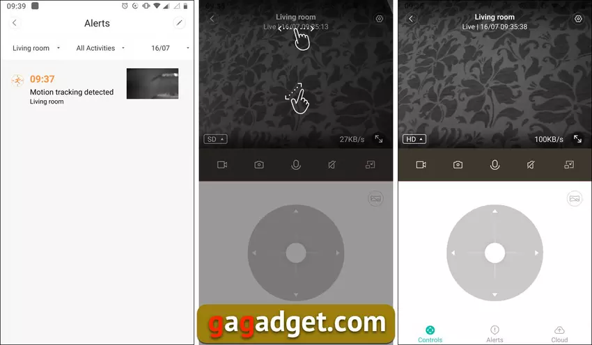 Kamera może obracać głowę o 360 stopni i pochylać oraz podnosić obiektyw o 102 stopnie. Podczas przesuwania silników nie słychać wcale, i oni po prostu nie mogą obudzić dziecka lub kota, ani przestraszyć włamywaczy. A przeciwko nim ten aparat jest całkiem skuteczny: ma wbudowane śledzenie poruszającego się obiektu, to znaczy może podążać za przechodzącymi ludźmi, automatycznie obracając się za nim. Oczywiście, nie reaguje natychmiast na szybki ruch, ale mimo to, jeśli przejdziesz spokojnie, w każdym razie pozostaniesz w ramce - podąży za poruszającym się obiektem, jeśli jesteś sam. Jeśli jest więcej obiektów, kamera nie zrozumie, kogo śledzić, i odwróci się w stronę tych, którzy są bliżej czujników. Kamera może poruszać się o 360 stopni, pokrywając wszystko wokół. Wie nawet, jak robić zdjęcia panoramiczne, przesyłać je później do telefonu lub być kontrolowana z twojej strony - w aplikacji są duże przyciski obracania kamery we właściwym kierunku, krok obracania jest mały i wystarczający do dokładnego dostrojenia pozycji kamery.