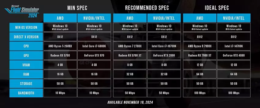 Asobo Studio opublikowało wymagania systemowe dla Microsoft Flight Simulator 2024 i z jednej strony są one dość łagodne, ale z drugiej wymagają sporej ilości pamięci RAM. Przy minimalnych ustawieniach potrzebujemy 12 GB RAM, a by cieszyć się wszystkimi urokami Ziemi powinniśmy mieć 64 GB. Do zainstalowania gry wystarczy jednak tylko 50 GB, podczas gdy ostatnia część zajęła ponad 100 GB.