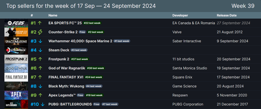 EA Sports FC 25 zajął pierwsze miejsce, czego można się było spodziewać po symulatorze sportowym. Drugie miejsce przypadło ponadczasowemu klasykowi Counter-Strike 2. Brązowy medal przypadł Warhammer 40,000: Space Marine 2.