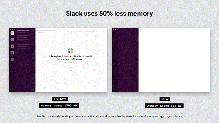 Zespół Slack informuje, że wzrost prędkości powinien wynosić około 33%. Rzeczywiście, aplikacja otwiera się szybciej, jak w internecie, a także w wersji desktopowej. Przebudowa kodu podstawowego powinna zmniejszyć zużycie pamięci do 50%. Slack nie tworzy osobny formularz wniosku dla każdego obszaru roboczego, co również poprawia wydajność.