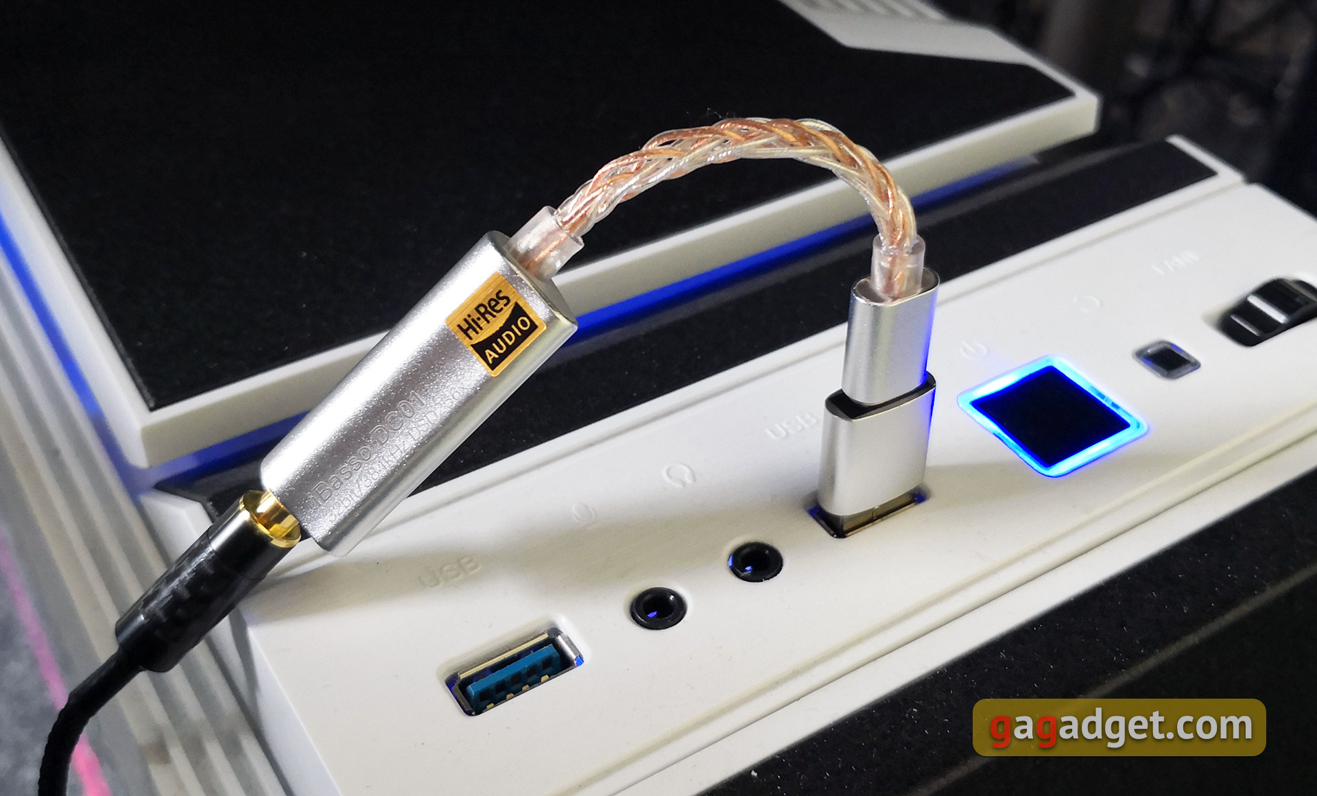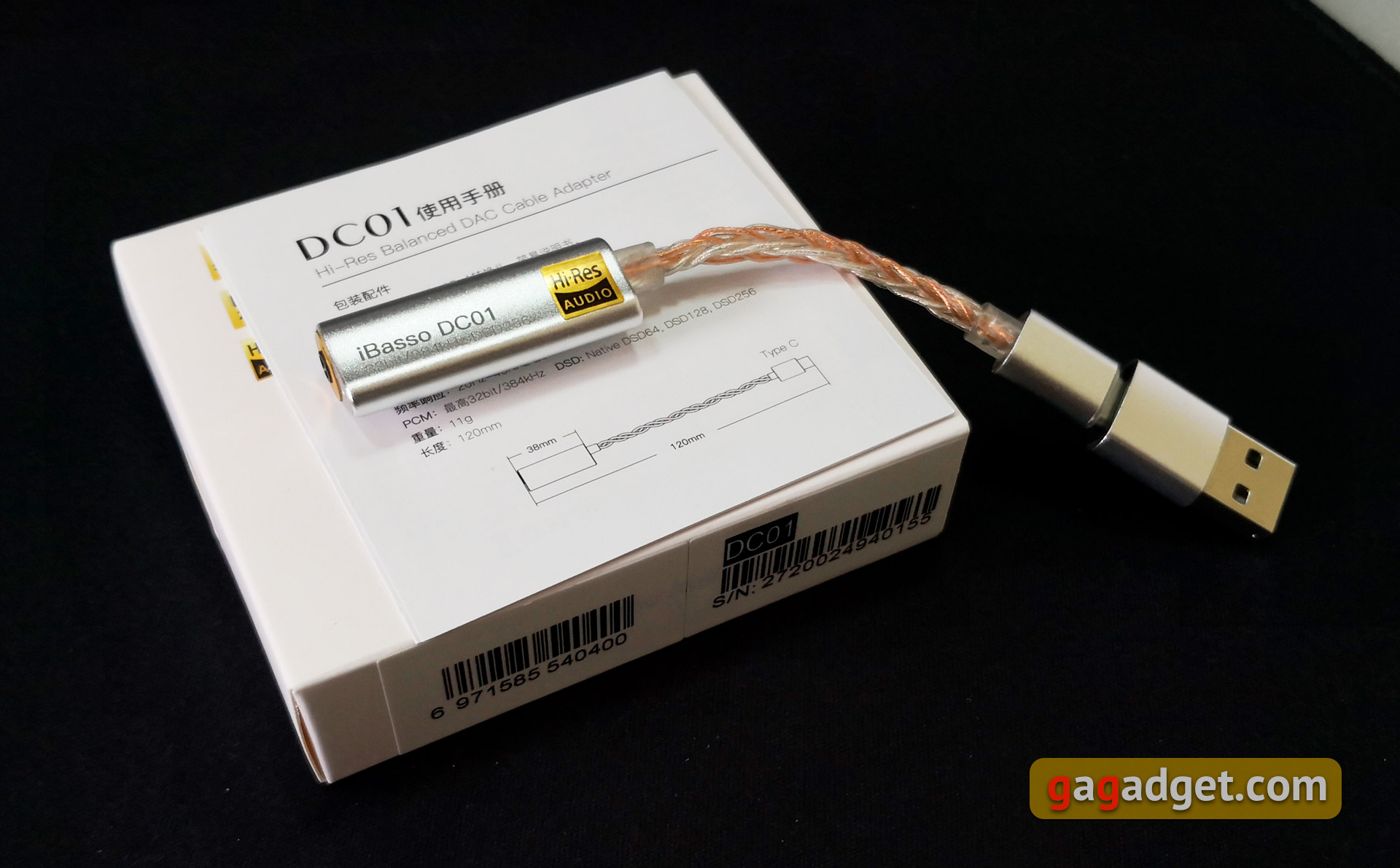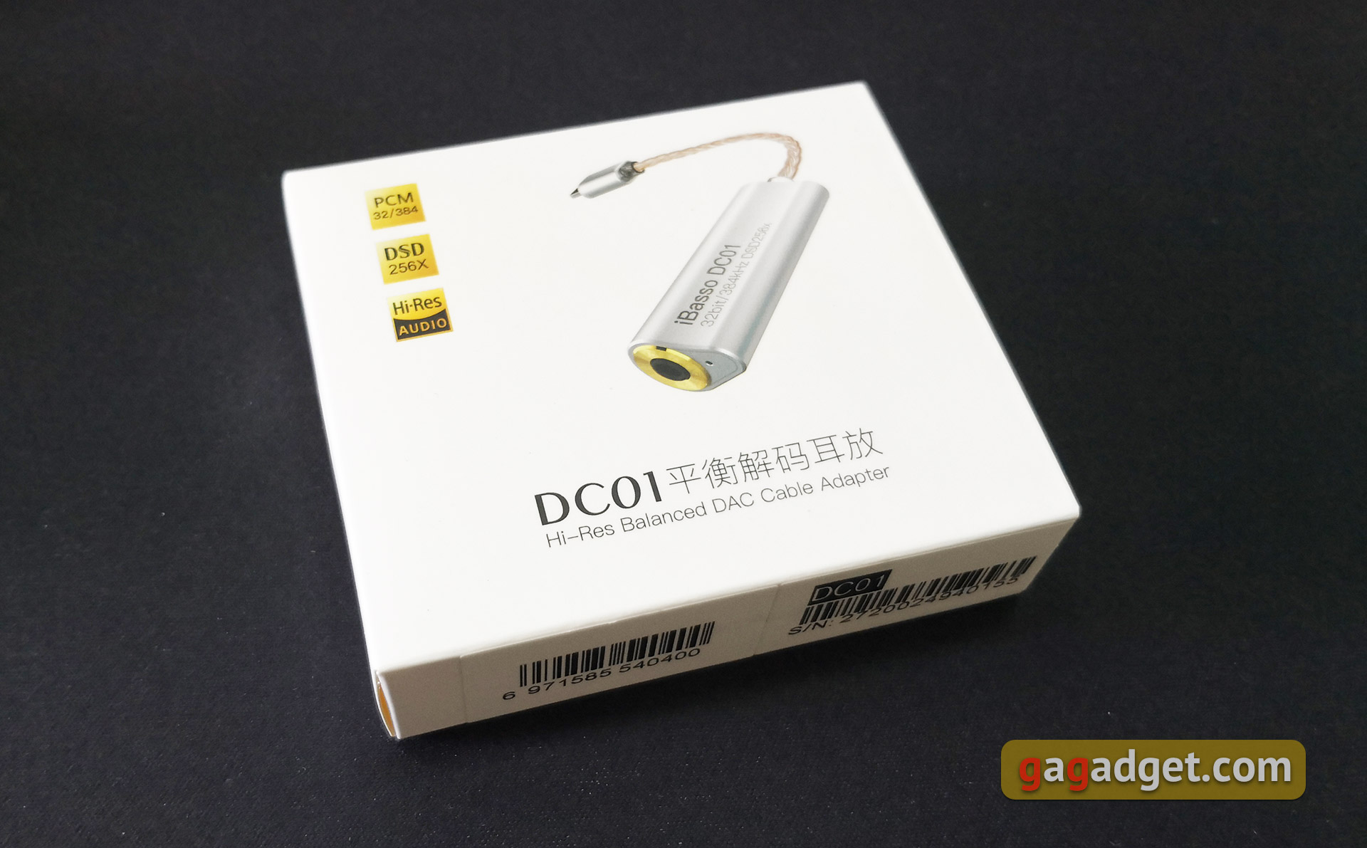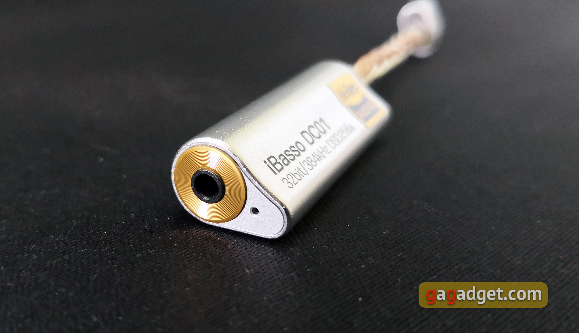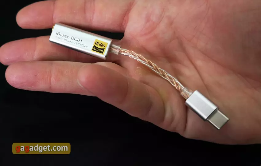 IBasso DC01 wygląda bardzo przyzwoicie, jeśli nie czepiać się do drobnostek, o których będziemy mówić poniżej. Urządzenie składa się ze złącza typu C i samego DAC, które są połączone przewodowym kablem. Kabel połączeniowy jest mały, wizualnie - podobny do kabli słuchawek iBasso. Chociaż w tym przypadku do niego jest nadawana „cyfra”, zamiast analogowego sygnału. Obie części są wykonane ze srebra. W bloku z całą główną elektroniką znajduje się nazwa modelu, informacje o wsparciu PCM 32 bity / 384 kHz i DSD256, a także dumna naklejka Hi-Res Audio: