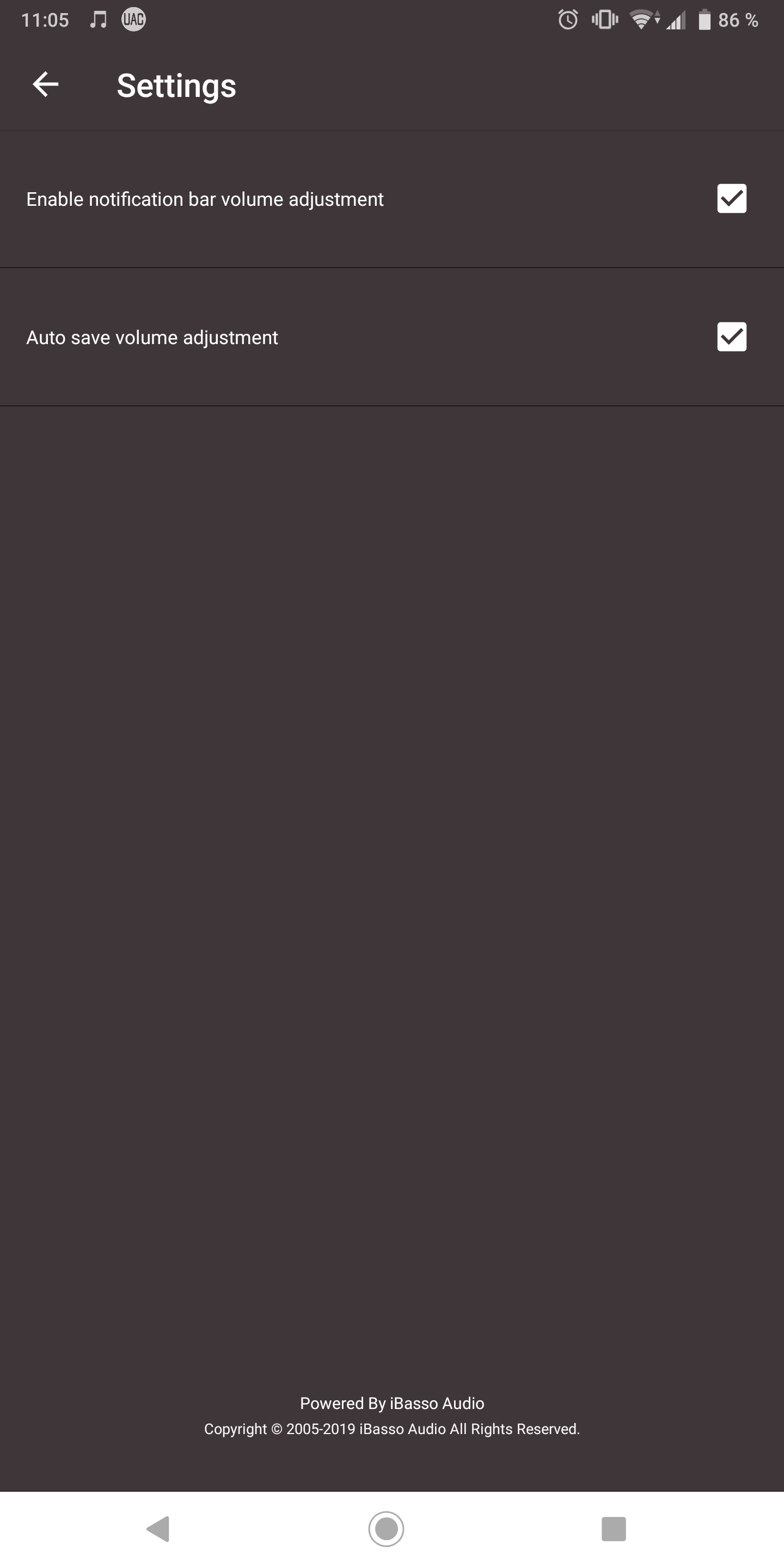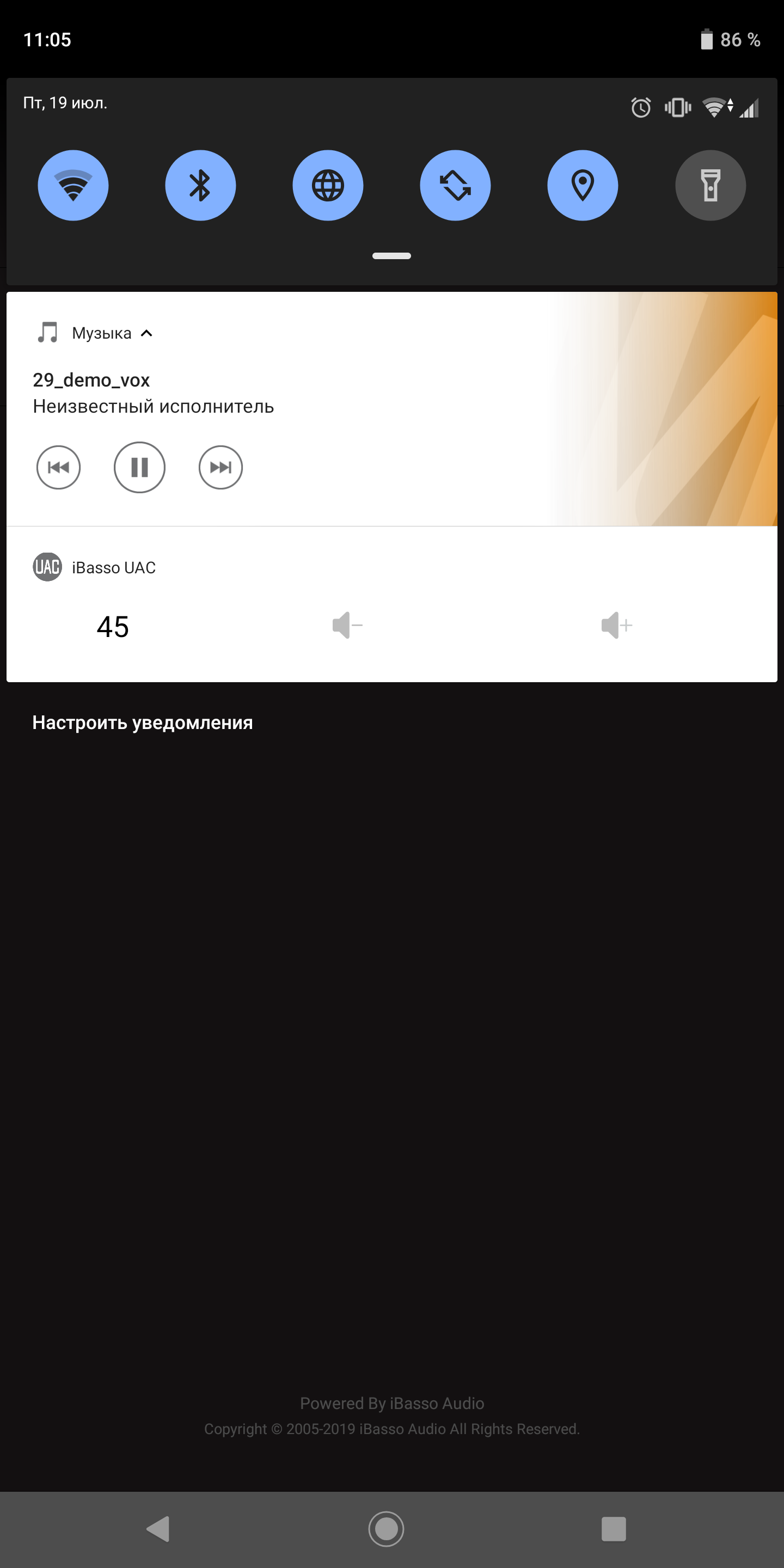 W przypadku smartfona działa schemat „Plug & Play”, ale wciąż jest nieco bardziej skomplikowany. Smartfony z systemem Android 5.0 i nowszym obsługują protokół USB audio klasy 2.0 (UAC2.0), ale domyślnie protokół SRC (z obniżaniem częstotliwości próbkowania) jest używany do zapewnienia zgodności z dużą liczbą urządzeń. W rezultacie, po podłączeniu do smartfona, sprzęt iBasso DC01 jest ustawiony na maksymalną głośność, a regulacja następuje tylko w odtwarzaczu muzycznym smartfona. W rezultacie mamy szum i zniekształcenia. Ten problem został rozwiązany dzięki oprogramowaniu układowemu iBasso UAC: dodaje 64-stopniową kontrolę głośności do samego iBasso DC01. Obniżamy głośność w aplikacji i pozbywamy się hałasu. Sama aplikacja jest niezwykle prosta: w rzeczywistości istnieje regulacja głośności i kilka dodatkowych funkcji. Zapisując wybrany poziom głośności, uruchom automatycznie aplikację po podłączeniu iBasso DC01 i dostosowaniu głośności w odcieniu powiadomień. Co ciekawe, że w Google Play aplikacja jest, ale instalacja jest niedostępna, więc musisz pobrać plik APK z oficjalnej strony: