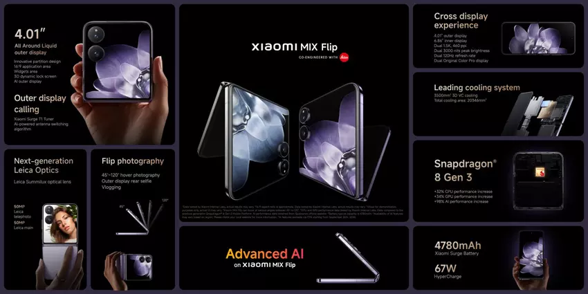 Xiaomi Mix Flip jest wyposażony w 4-calowy wyświetlacz OLED i 6,86-calowy ekran główny OLED.