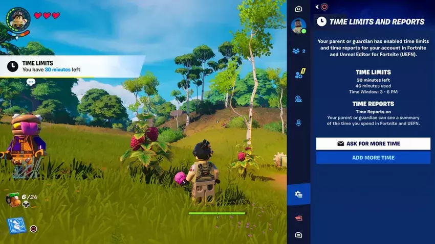 Rodzice mogą teraz wybrać, ile czasu ich dzieci mogą spędzać w grze każdego dnia, a także ustawić okna czasowe dla gry. Jeśli limity czasowe są włączone, dzieci otrzymają powiadomienia 30 minut przed końcem dozwolonego czasu. Czas jest śledzony zarówno w trybach stworzonych przez Epic Games, takich jak Battle Royale i Lego Fortnite, jak i niestandardowych trybach stworzonych za pomocą Unreal Editor for Fortnite (UEFN).