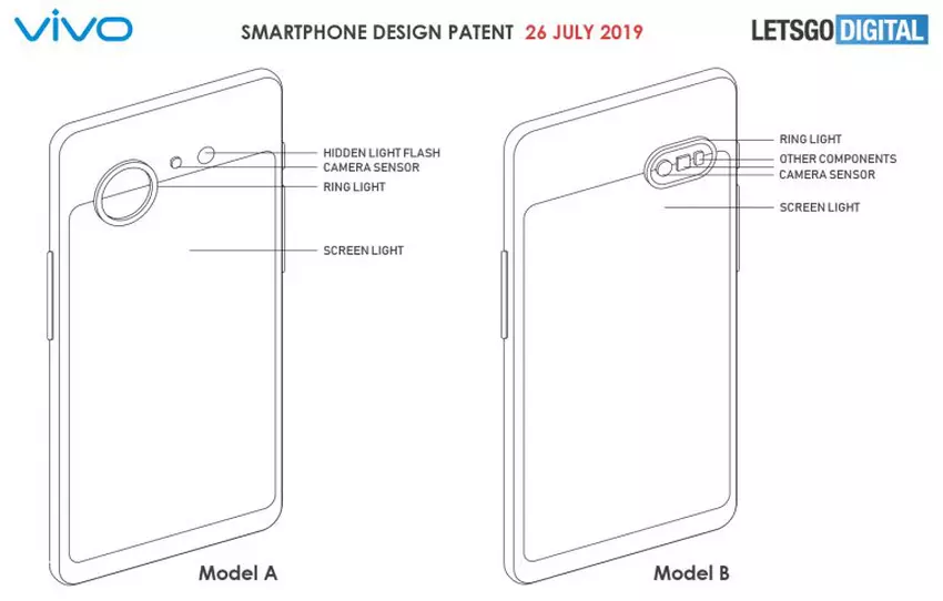 Jak widać na rysunkach, modele A i B to dwa różne modele telefonów z dwoma wyświetlaczami. Podobnie jak smartfon Vivo NEX Dual Display, mają pełnoekranowy wyświetlacz z przodu i drugi ekran z tyłu obudowy.