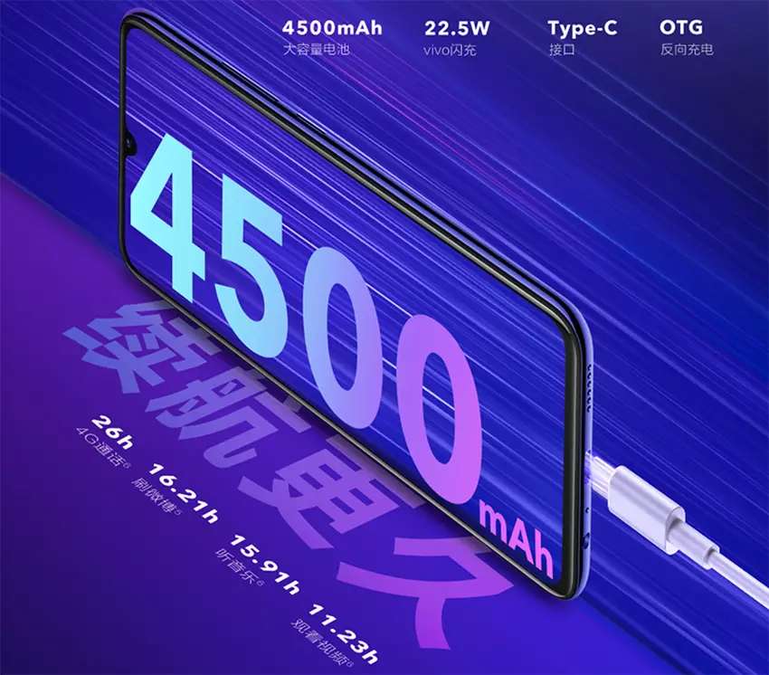 Bateria jest dość pojemna - 4500 mAh. Obsługuje szybkie ładowanie o mocy 22,5 W, co pozwala na uzupełnienie 50% energii w zaledwie 30 minut. Ponadto Vivo Z5 otrzymał odwrotne ładowanie, czyli sam smartfon będzie mógł ładować inne gadżety.