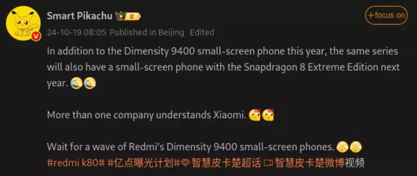 Informator Smart Pikachu twierdzi, że ten mini-flagowiec może otrzymać procesor Dimensity 9400 i pojawi się pod koniec tego roku, podczas gdy może istnieć również kompaktowy wariant z chipem Snapdragon 8 Elite, który zostanie wydany w przyszłym roku. Oba smartfony, sądząc po tagach w poście informatora, będą należeć do serii K80. Jeśli zostanie to potwierdzone, Redmi dokona interesującego wyboru, wykorzystując flagowe procesory MediaTek i Qualcomm w tej samej serii.