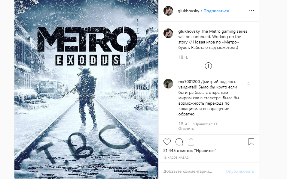 Na stronie Instagrama Dmitry zadowolił subskrybentów potwierdzeniem rozwoju nowej gry we wszechświecie Metro. Autor postanowił nie dokuczać fanom zwiastunami, pisząc: „W Metro będzie nowa gra”. Nie wiadomo, na jakim etapie rozwoju jest ten projekt, ale gracze dowiedzieli się o umowie między THQ Nordic i 4A Games pod koniec maja, a teraz Dmitry pracuje nad fabułą gry.